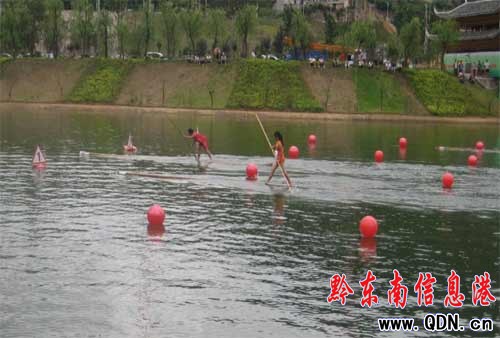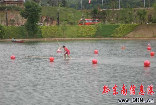 下午的獨竹漂比賽有來自麻江、凱里、凱里學院、錦屏、榕江和施秉等六個代表隊參加了比賽。經過激烈的淘汰賽,最終進入決賽的分別是凱里學院代表隊、麻江代表隊、榕江代表隊、凱里代表隊四支隊伍。