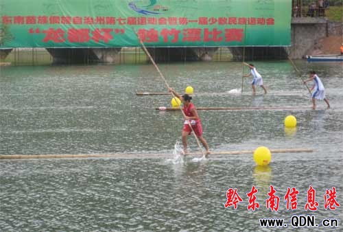 本港訊 (記者 廖強 實習記者 劉承宇 攝影報道)7月23日下午,黔東南州第七屆運動會暨第一屆少數民族運動會獨竹漂比賽正式開始。首枚金牌在女子60米直道競速賽中產生,由凱里學院選手楊蓉以35秒24的成績取得。