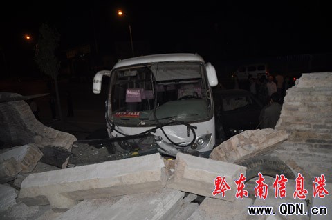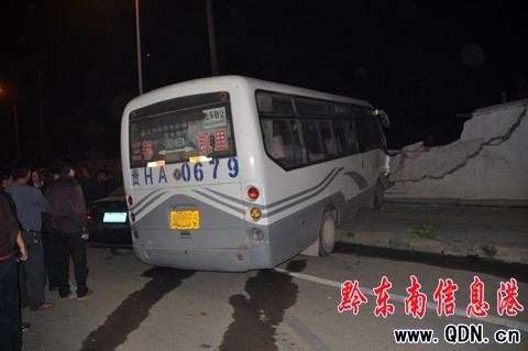 目擊者介紹說,事發(fā)時(shí),黑色小轎車從凱里永華廠方向而來,車上裝載三名司乘人員。車輛行至事發(fā)處,跨越雙實(shí)線調(diào)頭,就在這時(shí),一輛裝載10多名乘客的客車從麻江方向駛到,眼看就要撞上了調(diào)頭的轎車。如果真撞上,轎車上的司乘人員不死就傷,那是毫無疑問的。就在這緊要關(guān)頭,客車駕駛員朝線外撥打方向盤,車輛很快“跳”上公路路坎,撞翻了一株行道樹,然后“轟然”一聲,公路旁側(cè)的圍墻垮了一大截,露出了一個(gè)大大“月牙口”。