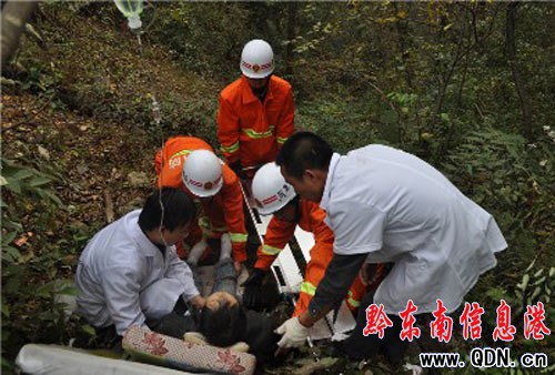 事發地點位于雷山縣城往方祥鄉方向27公里處,途徑雷公山自然保護區,全程路況較差,山路崎嶇且道路狹窄,用時1小時20分鐘才趕到現場。經詢問知情人和現場偵察得知,事故共造成兩人被困,其中一名傷員已被醫務人員救出,另一名被困者腰椎骨折,傷勢嚴重。現場指揮員當即命令官兵帶上破拆工具、繩索和擔架,沿壕溝向下100多米到事故現場進行救援,同時要求官兵注意自身安全,防止被山崖上的落石砸傷。經過十分鐘的奮戰,我消防官兵順利將被困人員救出,由現場醫護人員為其進行簡單的救治,然后消防官兵迅速將傷者捆綁在擔架上,沿壕溝向上抬到公路上,由120送往醫院救治。