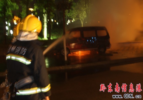 11月20日凌晨,兩名消防官兵在向著火面包車噴水