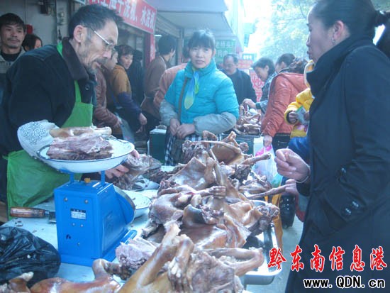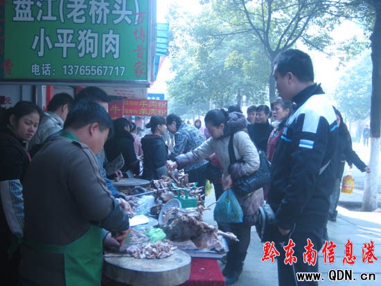 本港訊 (實習記者 龔秀相 攝影報道)12月22日上午,在凱里市供電局附近,記者看到幾家狗肉館門前都擠滿了人,生意異常火爆。記者心生好奇,便走近去看,一位剛稱完狗肉的市民向記者說,今天是“冬至”,冬至一定要吃狗肉。記者有點郁悶,于是咨詢了一位王伯伯,為什么“冬至”要吃狗肉?他說,傳說中都說:“冬至”吃狗肉,身體才會不怕冷,整個冬天都會暖和。冬至是一年二十四個節氣中的其中之一,吃狗肉也就成了這個節氣的傳統習俗,每到冬至,大家都會按照習俗吃狗肉,營造節日的氣氛。