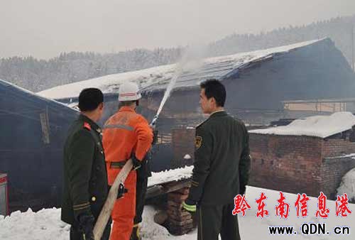 1月18日8時56分,天柱大隊接到報警稱,距縣城約10公里的十里沖磚廠廠棚因積雪不堪重負,隨時都有垮塌的危險,請求消防官兵出動救援。