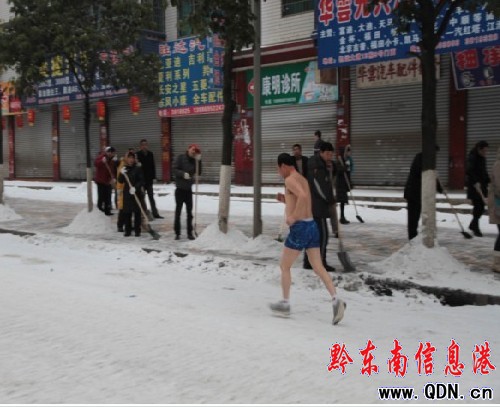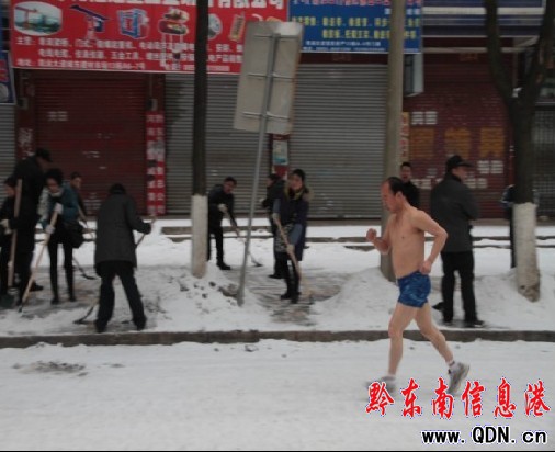 男子雪天晨練衣著猶如夏天 驚煞旁人(圖)