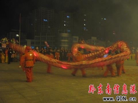 8:30分,凱里市行政中心響起了熱鬧的禮花聲,一朵朵漂亮的禮花在空中綻放,市民們不時(shí)的拿著手中的相機(jī)抓拍住美麗綻開(kāi)的煙花,只見(jiàn)這時(shí),舞龍的師傅指揮著舞龍的隊(duì)員們拉開(kāi)距離,市民們也自覺(jué)的聽(tīng)著指揮圍在外圈,不一會(huì)兒,舞龍表演開(kāi)始了。一支支舞龍隊(duì)用他們精彩的表演呈現(xiàn)在市民面前,有的市民還伸手去摸其中一支龍的鱗片,說(shuō)這樣能讓自己一年帶來(lái)好運(yùn)。