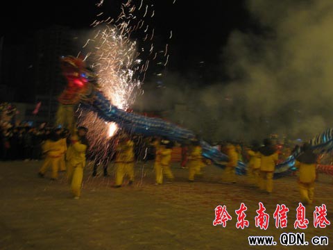 每一支舞龍隊(duì)的師傅都在不斷變換著花樣,真是讓市民大飽了眼福,舞龍師傅一會(huì)而將龍舞成直線,一會(huì)兒將龍舞成疊狀,一圈圈疊起,一會(huì)兒龍頭不時(shí)的擺動(dòng),龍身卻在活躍的奔跑,活像一只在奔騰的飛龍。當(dāng)工作人員將煙花直朝龍身上噴射時(shí),那場(chǎng)景更是壯觀,舞龍師傅這時(shí)似乎也更賣(mài)力,將龍舞得更加活靈活現(xiàn),在這樣一個(gè)歡騰的夜晚,不盡讓凱里市民度過(guò)了一個(gè)歡快的元宵。