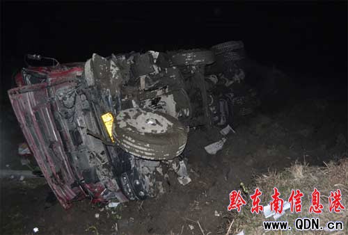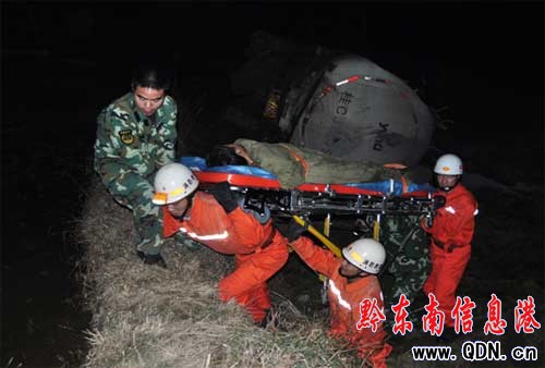 01時57分,消防官兵到達事故現場后,經偵察和詢問得知:一輛牌照為桂CJ16**的大噸位水泥槽車在轉彎過程中,撞垮路邊防護墩翻下農田,車上1名人員被困駕駛室。根據現場情況,消防官兵立即利用撬棍、鐵鋌清理車前擋風玻璃處的碎片,擴大救援空間,隨后在官兵的協同配合下將傷員救出。時值深夜,寒風呼嘯,被救的傷員此刻已處于半昏迷狀態,全身濕透,不停的打著冷顫。為了盡快將傷員送往醫院救治,消防官兵克服一切困難,抬著傷員艱難行走在狹窄的田坎上,經過近20分鐘的不懈努力,傷員被成功抬上了120急救車。