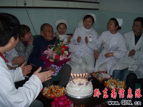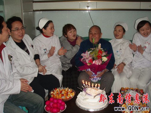 當護士長陳振梅了解到3月6日是老人的生日后,她與科主任商量決定在病房里為老人過這次生日,她們買來了鮮花和蛋糕,2011年3月6日,在州人民醫院外五病房,筆者拍下了這溫馨感人的一幕。(羅茜)