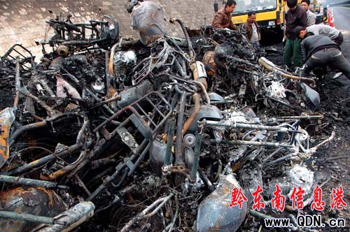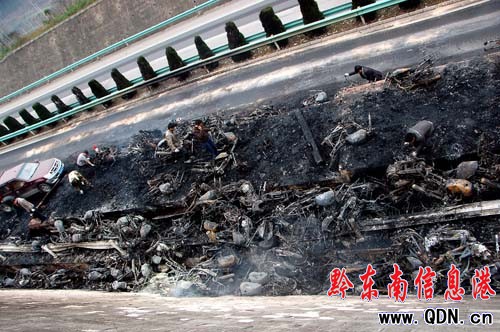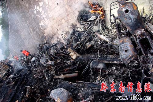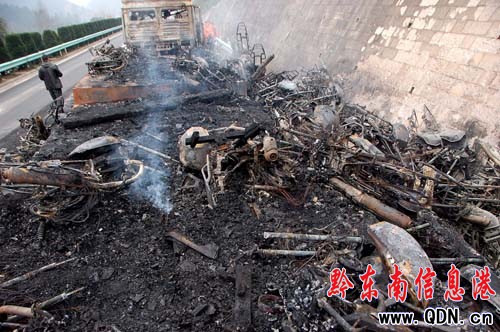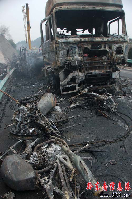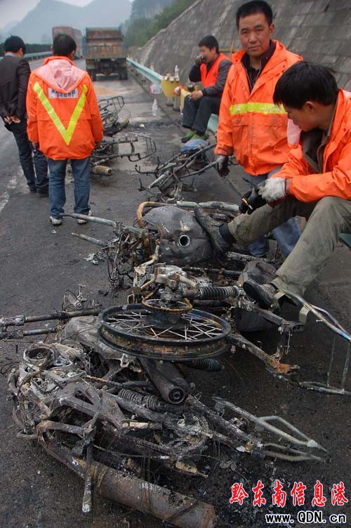 事發當日清晨,記者趕往現場。現場肇事大貨車已面目全非,車上所載摩托新車全部燒成“光架架”,成廢墟一堆,大貨車已被燒報廢,廢墟上仍有余火在燃燒。路政部門工作人員正在清理現場,移除處置這堆廢品。
