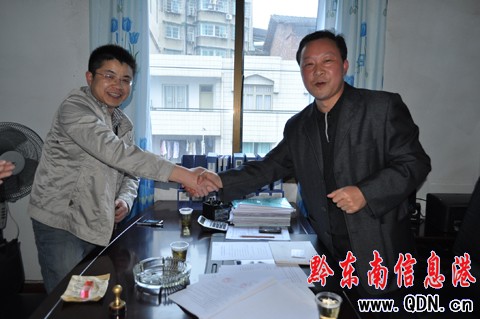 凱里市公交總公司經理陸承輝與黃平縣交通運輸局局長鄒斌簽約后握手慶賀