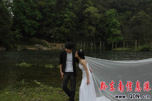 黎平八舟河上的紅色景點(diǎn)紅軍橋已成為湖南長沙、廣西南寧、貴州貴陽等城市結(jié)婚新人拍攝婚紗紀(jì)念照的好地方。截至4月10日,已有80對新人,來到這里拍攝婚紗照片。4月18日筆者在紅軍橋景點(diǎn)看到從貴陽乘飛機(jī)趕來拍攝婚紗照的周松和劉英,他們格外興奮,他們說,來這里拍結(jié)婚照的意義不一樣,這里有山、有水、還有紅軍橋,照片特有靈性。圖為他們正在拍照的情形。
