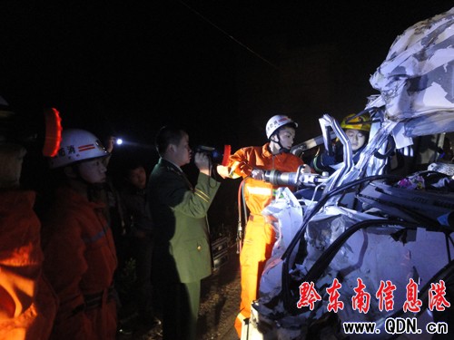 兩車相撞一人被困 施秉消防深夜急救援(圖)