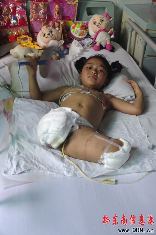 記者跟隨丁母來到州醫院病房里,看到了正躺在病榻上的小丁瑩。出乎意料的是,盡管才剛做完截肢手術,可小丁瑩并沒有那種大病初愈的虛弱現象,精神面貌極好,就好像患了點小感冒一樣“悠然自得”地躺在床上。丁母告訴記者,女兒的堅強令她們吃驚,剛剛出事時,她沒有流下一滴眼淚,還意識十分清醒地告訴醫生她們的電話號碼,“要不是她告訴醫生我們的電話號碼,我們也不可能在第一時間知道這個消息。”丁母說。