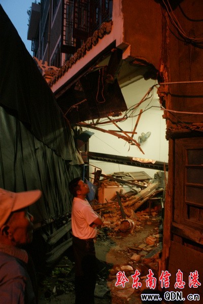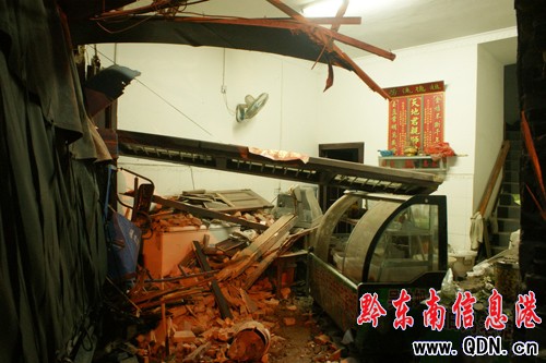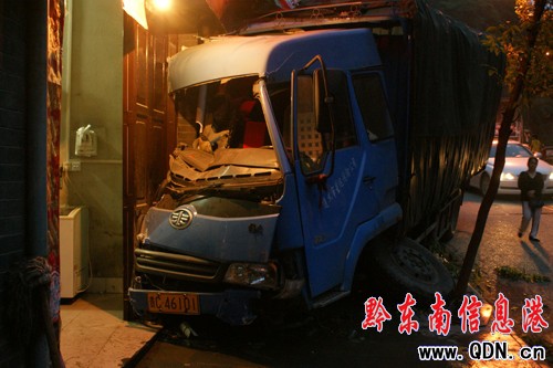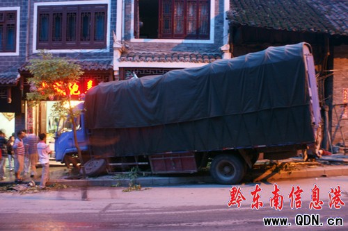 10日凌晨2時許,一輛解放大卡在鎮遠縣城東下長坡入城時失控,沖出路肩,壓過兩株行道樹后,把一棟民房的一面墻撞出一個大豁口,繼而前沖,撞在緊鄰的另一棟民房上。車子嚴重變形,駕駛室被嚴重擠壓,所幸駕駛員安全逃生,未受重傷。