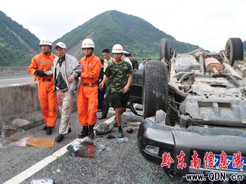 7月6日16時05分,貴州省臺江縣消防大隊接到報警稱:位于臺江至劍河高速公路新寨大橋路段發生一起交通事故,多人受傷,情況危急。接警后,9名消防官兵乘坐1輛搶險救援車、1輛指揮車趕往事故現場救援。