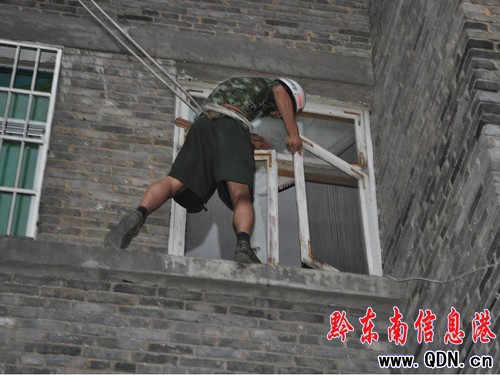 18時05分,消防官兵到達現場后,首先對現場進行察看,發現被鎖房子是在三樓的位置,而且被鎖房間有一扇窗戶未關,于是,指揮員決定從四樓放置安全繩,由一名戰士利用安全繩下到三樓打開窗戶進入屋內。在確定防護到位后,立即展開攀爬行動,在短短的幾分鐘內,消防員就將房屋門順利的打開了。戶主一家人見門被打開,緊皺的眉頭也松開了。(李斌 張金才)