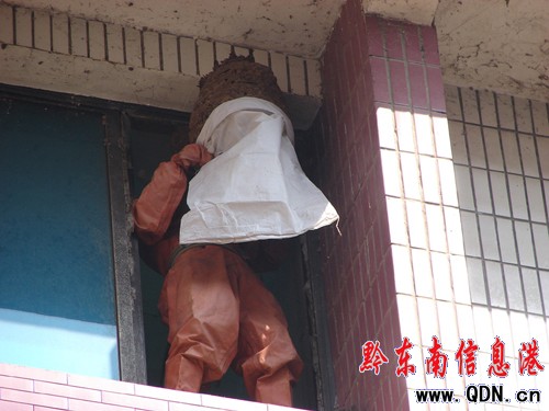 大約5分鐘后,官兵到達(dá)該住戶樓下,經(jīng)觀察發(fā)現(xiàn),該住戶所住的3樓公寓窗外被一巨型蜂窩“霸占”,巨型蜂巢直徑近1米長,且該窗戶外沒有防盜網(wǎng)。官兵經(jīng)討論后決定,派一名戰(zhàn)士穿上防化服并佩戴安全繩上前摘除,其余官兵保持一定距離并提醒附近住戶將窗戶緊閉,以防馬蜂傷人。準(zhǔn)備工作就緒后,官兵們各司其職按照分工迅速行動,經(jīng)過近15分鐘努力,官兵們順利將巨型蜂窩套入編織袋內(nèi),并向蜂巢殘留部分噴灑殺蟲劑。