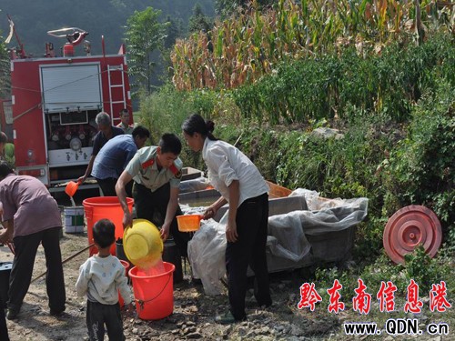 當消防車趕到滾馬鄉(xiāng)苗鳥村時,村民們遠遠的就開始喊“消防兵來了,消防兵來送水啦”。話音剛落,村里的鄉(xiāng)親們陸陸續(xù)續(xù)地拿著桶往村口奔來。下車后官兵們也顧不上山路顛簸的疲勞,立刻組織鄉(xiāng)親們把桶依次擺開,甩開水帶,架起水槍,為村民們送上股股清泉。在一車用完后,消防官兵采取消防車水泵吸水的方式去幾公里以外的河流加水后又為村民送去一車“清泉”,官兵們一直忙到中午才歸隊休息。