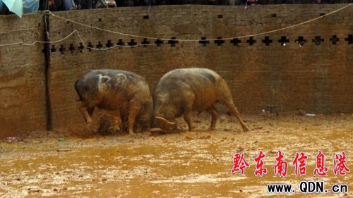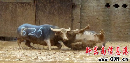 裁判員吹響了哨子,兩牛都挪動腳步,走向對方,但都不急于發起攻擊,在戰場兜了兩圈后,“胖子牛”利用“小爛”轉身之機下手,掄角打來,由于用力過猛,而且頭部壓得很低,觸及地面小水潭,導致污水亂濺開來。