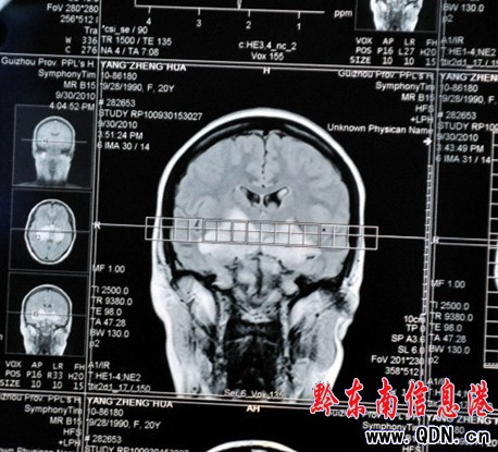 醫生診斷說,在楊正花的大腦里,有不明物體存在。記者通過這張照片看到,這個不明物體形狀很像一只正在煽動著翅膀的“蝴蝶”(如圖)。黔東南州家庭教育學會講師、中醫師潘思緯在看了診斷照片后認為,楊正花大腦中的“蝴蝶”極有可能就是腫瘤,它壓迫了視覺神經,導致失明。