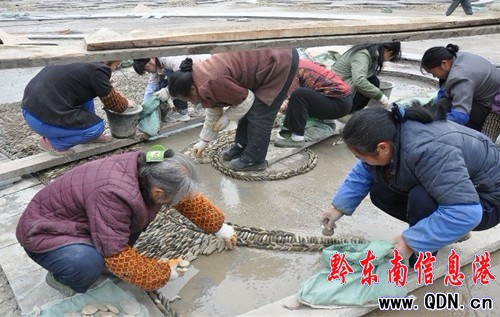筆者在施工現(xiàn)場看到,工人們有的忙著運(yùn)送材料、有的忙著鋪墊青石板,有的按走線仔細(xì)排放片狀鵝卵石精雕細(xì)刻圖案,整個施工場地一片繁忙。