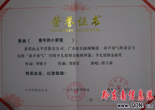 由廣州太平洋影音公司、廣東電臺新聞頻道、童聲童氣組委會主辦的“童聲童氣”全國少兒原創歌曲榜日前在廣州頒獎,黔東南州知名音樂人鄭建安原創少兒歌曲《童年的小籮筐》獲優秀“金曲獎”。