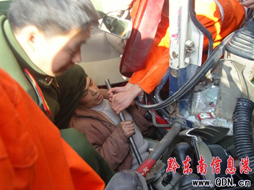 本港訊 (劉毅 張正特)12月3日,在施秉縣白垛鄉石家灣村小東邊,一輛運送砂石的大貨車,在行駛中不慎與一輛正在施工的挖機相碰撞,大貨當場側翻,車中兩人被嚴重變形的車頭死死卡住動彈不得,不停喊“救命!”施秉消防接警后,火速趕到現場,利用鐵鋌、液壓擴張剪等工具將車門撬開,移除貨車駕駛室內的變形鐵皮及駕駛室儀表盤等車身構件,給被困人員挪開空間。經過一個小時的援救,最終將兩人拽出“鬼門關”。