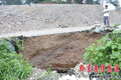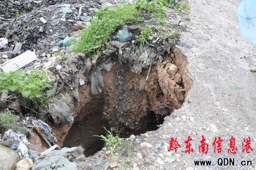 本港訊 (記者 楊驥 攝影報道)昨夜,一場大暴雨突如其來,凱里及周邊地區頓時洪水泛濫,而棉紡廠通向四聯村的鄉村公路上,也在暴雨過后突現大坑,路過的摩托車險被吞沒。