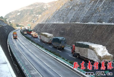 本港訊 (張健 特約記者 陳沛亮 攝影報道)受強(qiáng)冷空氣影響,凱里市境內(nèi)的滬昆高速路面結(jié)冰。2010年12月16日上午7時許,一輛運(yùn)輸數(shù)百頭活豬前往貴陽方向的卡車,行駛在滬昆高速1677公路處的求雨溝大橋上發(fā)生側(cè)滑,卡車原地掉頭橫堵交通,造成堵車數(shù)小時。