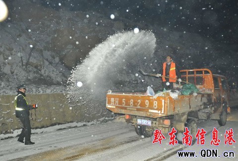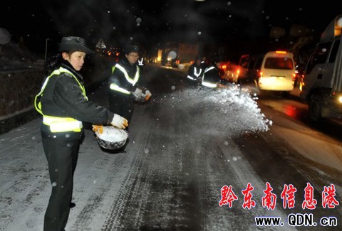 1月17日上午,黔東南州凱里市又迎來今年第三輪低溫大雪和凍雨天氣,1月17日下午4點左右,境內308省道278公里至285公里大部分路段路面出現嚴重結冰,致2000多輛汽車被堵在長達6公里的公路上。凱里公路管理段32名路政除冰突擊隊員迅速趕赴現場,頂著大雪,忍受饑寒,采取撒鹽化冰、救助車輛等措施,于當晚10點過,疏通所有滯留車輛。 (陳沛亮)