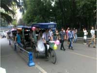 6月16日上午,在四川大學望江校區北園,10輛掛著粉紅色氣球的人力三輪車組成的迎親車隊成為校園中的一道風景線(見下圖)。在路邊同學的掌聲和羨慕中,27歲的男博士孫文魁和24歲的研究生女友走進了婚姻的殿堂。