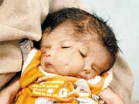 3月,印度一婦女誕下一名“雙面女嬰”,她的眼、口、鼻的數(shù)目均比普通孩子多出一倍(見下圖)。這個女嬰屬于畸形兒,但由于當(dāng)?shù)孛孕攀⑿,孩子的父母卻認為女兒是神靈轉(zhuǎn)世。當(dāng)?shù)卮迕褚才d奮異常,宣稱她是印度神甘奈施轉(zhuǎn)世投胎,對她的降臨頂禮膜拜,紛紛送錢送物表示祝賀。但是日前此女嬰已不幸夭折。