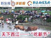 “卯日”(農歷5月29日)是雷山縣天下西江苗寨一年一度民族傳統節日——“吃新節”。節日期間,西江村“兩委”和寨老們共同組織群眾開展形式多樣的“牛王、鳥王”爭霸賽,苗族情歌對唱,“游方杯”籃球錦標賽和文藝晚會等。每天吸引了數千游客前來觀光和參加活動,使節日熱鬧非凡。據了解,整個節日活動將于7月24日結束。(張希才)