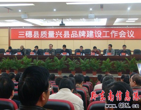 本港訊 (楊序勤 特約記者 楊榮昭)2010年11月23日上午,中共三穗縣委、縣人民政府組織召開三穗縣質量興縣品牌建設工作會議。參加會議的有縣直機關部門負責人、各鄉鎮人民政府負責人和企業代表98人。黔東南州質量興縣督查組以及凱里市、臺江縣、劍河縣、岑鞏縣、天柱縣質監局主要負責人和三穗縣委、縣人大、縣政府和縣政協領導出席會議。