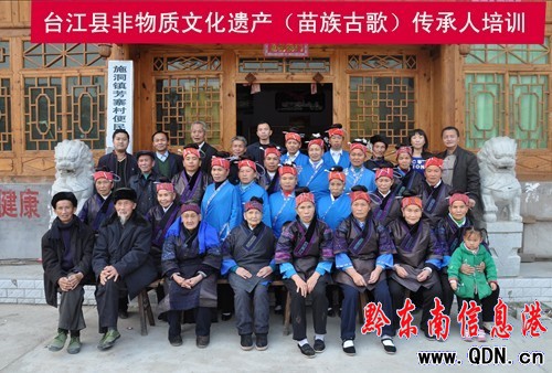 在施洞芳寨村,來自該鎮小河、巴拉河、塘壩、平兆、良田、岑孝等村的苗族古歌師、飛歌師、酒歌師40余人參加了培訓會,會上,縣非遺辦組織學習了《中華人民共和國非物質文化遺產法》等法律法規,并就保護和傳承臺江縣豐富的苗族音樂進行了積極探討。培訓會以歌會友,所有參訓的歌師們還進行了苗族古歌吟唱,苗族飛歌對唱,情歌演唱等,該縣電視臺進行了現場錄制,培訓搜集工作取得很好的效果。