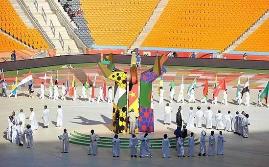 騰訊體育訊 2010年6月10日,南非世界杯開幕式即將來臨,約翰內斯堡足球城體育場內彩排首度曝光。大概有1500名演員身穿演出服來到世界杯揭幕戰球場進行開幕式的最后彩排。從記者打探到的消息來看,開幕式開始有一大段舞蹈表演,所有演員對開幕式都守口如瓶,因為和北京奧運會相同,他們也簽訂了保密協議。