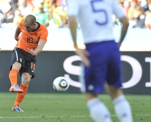 荷蘭第53分鐘打破僵局!斯內德左側策動進攻,范布隆克霍斯特傳中,田中斗莉王沖頂解圍未出禁區,范佩西背身回傳,斯內德左側距門20米處右腳大力抽射近角,雖然川島永嗣向右側撲碰到了球,但球還是變線入遠角,1比0。這是斯內德63場國家隊比賽第15球。