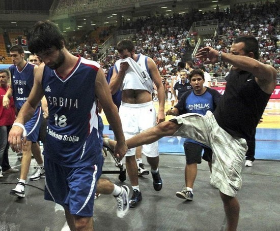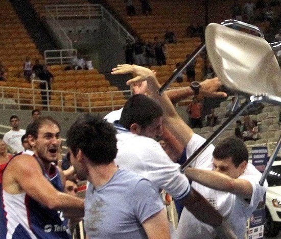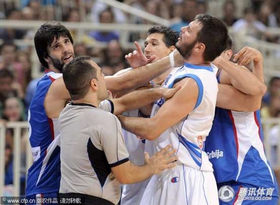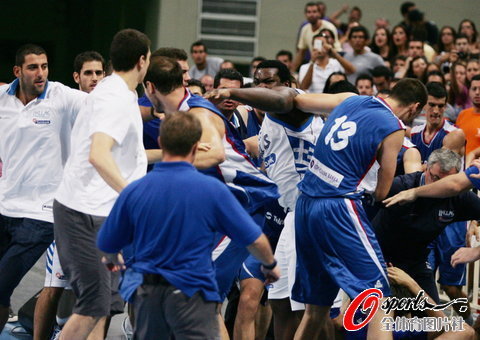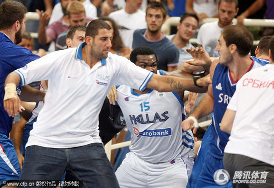 騰訊體育訊 北京時間8月20日,在一場塞爾維亞對陣希臘的四國邀請賽中,雙方球員在比賽行將結束時上演了打斗鬧劇,比賽因此中斷。沖突中希臘中鋒博羅西斯頭被打破,血濺賽場,前中國男籃主帥(現希臘主帥)也跑向球場將受傷球員保護出場外。