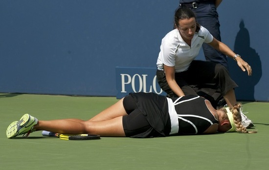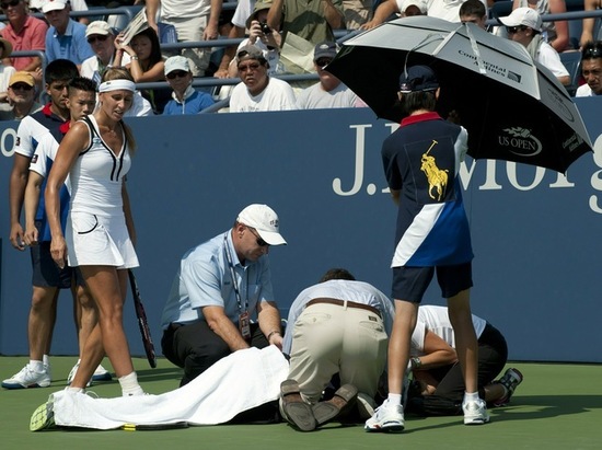騰訊體育訊 北京時間9月1日消息,在今日進行的2010年美網(wǎng)女單第二輪比賽中發(fā)生了一起意外事件——賽會10號種子、白俄羅斯天才阿扎倫卡在與阿根廷美女杜爾科的比賽打到首盤1-5時突然倒地不起,隨后被輪椅送出場外。這位天才少女的身體狀況令人揪心。