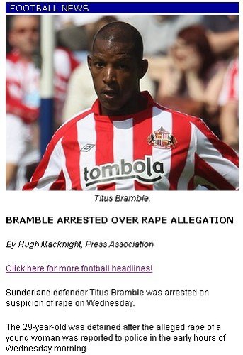桑德蘭后衛(wèi)布蘭布爾因?yàn)樯嫦訌?qiáng)奸被逮捕