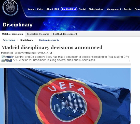 新浪體育訊 北京時間12月1日凌晨,歐足聯官方宣布,鑒于皇家馬德里隊主教練穆里尼奧、球員阿隆索、拉莫斯、卡西利亞斯和杜德克在11月23日冠軍杯與阿賈克斯隊比賽中的不正當行為的表現,歐足聯紀律委員經過研究對上述球隊、教練以及相關球員做出判罰如下: