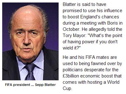 《泰晤士報》則挖出一個國際足聯(lián)的內(nèi)線稱,在申辦過程中,某個國家對每個有投票權的執(zhí)委都承諾100萬英鎊的好處費,這名線人稱,他可以提供出接受賄賂的執(zhí)委姓名、交易的地點和時間,他還說:“很簡單,就是金錢買選票!