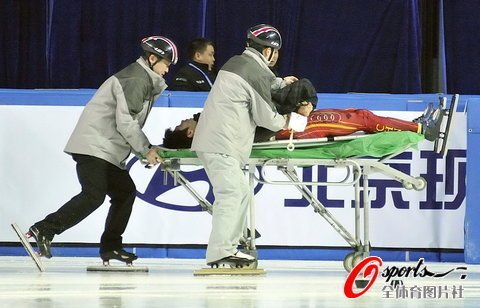 騰訊體育訊 北京時(shí)間12月12日,2010-2011賽季短道速滑世界杯上海站繼續(xù)展開鏖戰(zhàn),在男子500米半決賽角逐里,中國選手韓佳良因韓國選手金炳俊犯規(guī)干擾摔出賽道,并被韓國選手的冰刀割傷血染賽場(chǎng),被擔(dān)架抬出場(chǎng)外。