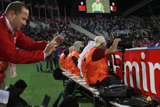 我很退讓的將手機里的照片一一刪除為了就是能盡快出場去工作,沒有電腦,我的相機還在,可以先拍再想辦法,電腦的事下來再解決。在此期間我偷著用另外當地號碼的手機分別給后方和前方取得了聯系,由于我在場內前方同事沒法進場,只好找相關人進行溝通。大家一致認為先想辦法回到賽場。可我按照他們的要求把相片刪除后,他們竟然又反悔了,證件依舊不給我,我不知道卡塔爾警察究竟想干嘛,我無助的坐在那里透露窗戶看著比賽。我看既然這樣了,就索性盡力穩住情緒和他們商量,我對他們說,我可能因此丟掉工作,電腦的事我不追究,你把證件給我,我進場拍場內比賽總可以吧。此時比賽已經進行了15分鐘,他們對我說你拍場內可以,別的不準寫,這件事不能報。沒有辦法,為了我的證件只好答應他們。他們這才讓我重新進場。