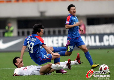 第69分鐘,薩梅隆禁區(qū)內(nèi)拿球,后腳跟傳給插上的姜坤,但被孫繼海捅回,薩梅隆再次得球,大力抽射飛出底線。第74分鐘,饒偉輝在左路斷球后突入禁區(qū),回防的卡斯特羅從身后將其推到,主裁判依然沒有判罰點(diǎn)球。