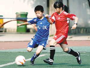 為了推廣和普及足球運動,新城小學今年更是將足球列入校本課程,并推出自己的女子足球年度聯賽,各年級的冠軍獎金均為300元。“全校1000多名學生,每個學生都能確保一節足球課,為此,學校還專門編了一套足球操,很多孩子就是因為做操喜歡上了足球,并主動加入到了足球訓練中,”劉方敏說,“學校足球隊從原來的40名女隊員發展到了目前的男女足近百人的齊頭并進的局面。”