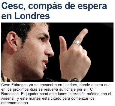 法布雷加斯的人回到了倫敦,心卻留在了巴塞羅那。此次返回倫敦后,小法立刻向阿森納方面表達了轉會態度,他希望能在本周日(7月10日)前完成與巴薩之間的轉會工作。《每日體育報》認為,小法此次返回倫敦并非重新與溫格融為一體,而是不欲與阿森納激化矛盾,渴望通過和平的方式解決分歧,他不想以馬斯切拉諾在一年前的方式離隊。