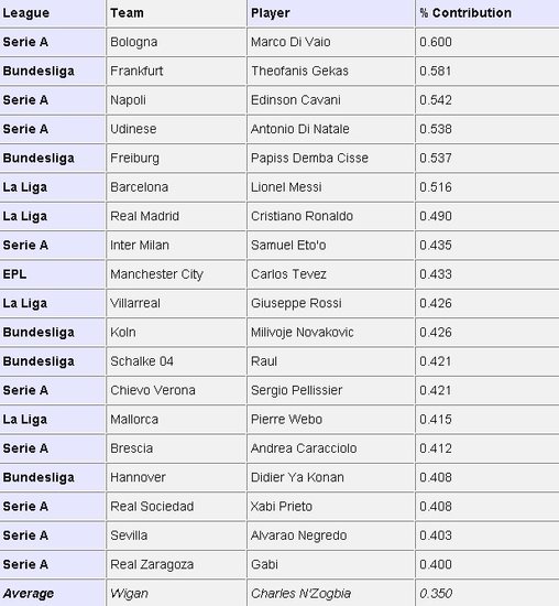 根據這種計算方式,球迷們所熟悉的那些超級球星們在2010-2011賽季中為球隊所做的積分貢獻并不如人們想象的那么多。比如巴塞羅那的金球獎得主梅西,盡管上賽季聯賽為巴薩打入31球助攻18次,但51.6%的貢獻率只能排在第6位!而皇家馬德里的頭號球星C羅排名甚至更低,49%的貢獻率位列梅西之后。其他成名射手中,國米王牌埃托奧緊隨葡萄牙人(43.5%),還要經受曼城前鋒特維斯 的追趕(43.3%)。有意思的是,獵豹和野獸這兩位傳聞中很可能互換東家的鋒將不僅年薪相差無幾,連貢獻率都只差零點幾個百分點。此外,今夏轉會紅人朱塞佩-羅西也為比利亞雷亞爾貢獻了42.6%的積分,沙爾克04的傳奇射手勞爾也不遑多讓,42.1%的貢獻率讓人既贊且佩。