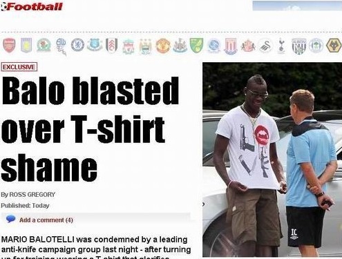 《太陽報》這樣描述到:“巴洛特利剛剛結束假期返回英格蘭,而他第一天出現(xiàn)在曼城的訓練場上就讓人大吃一驚。因為他居然穿著一件弘揚暴力、血腥甚至是色情的潮流T恤。”該媒體還對這件T恤進行了描述,“上面印有機關槍、手槍、刀具以及一個流著血的女人的嘴,整件T恤看起來甚至有些恐怖,不堪入目,讓人有些害怕。”