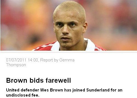 騰訊體育訊 北京時間7月7日晚,英超豪門曼聯在其官方網站宣布,右后衛韋斯-布朗正式轉會桑德蘭。同時另外一位曼聯球員奧謝也正在接受桑德蘭體檢,一旦通過他將和布朗一同加盟桑德蘭。布朗和桑德蘭簽署了一份為期4年的合同,而奧謝預計也將在光明球場留至2015年夏天。